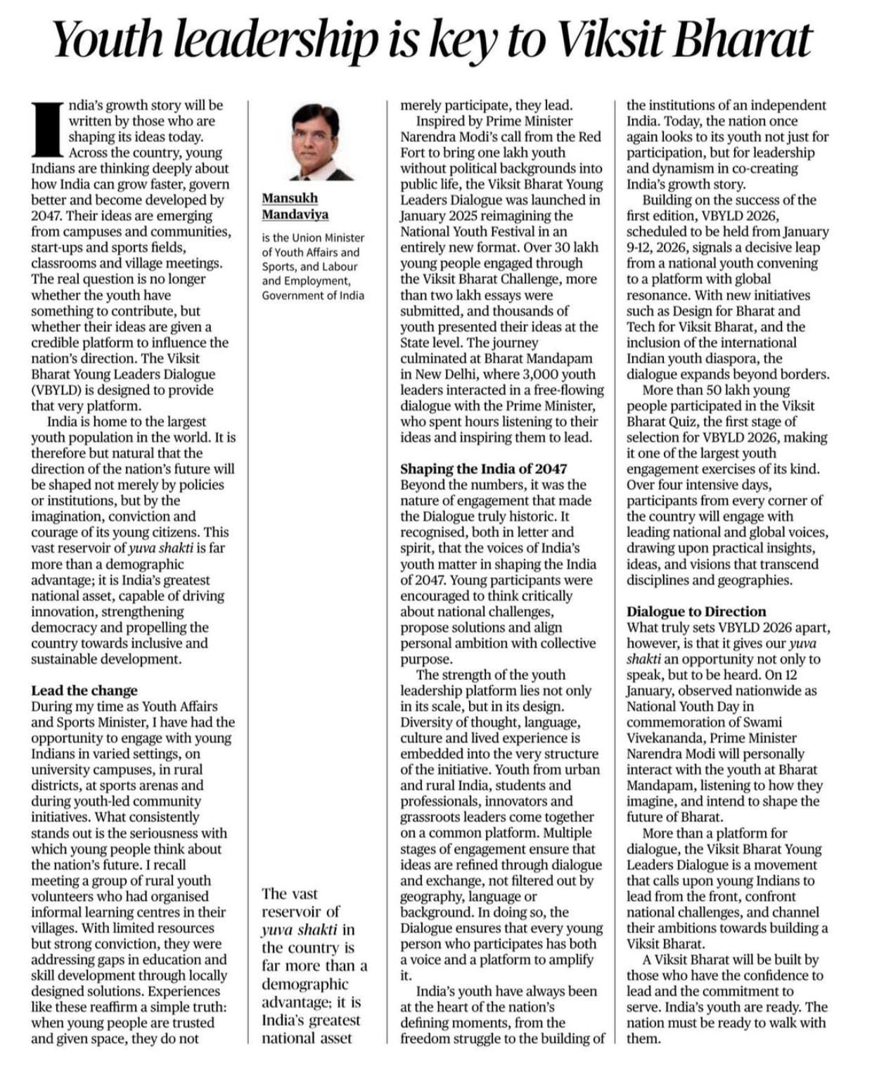 The Viksit Bharat Young Leaders Dialogue empowers our Yuva-Shakti to lead from the front, take on real challenges, and co-create India’s future. From 9–12 January at Bharat Mandapam, young leaders from across Bharat will converge to present their ideas on Viksit Bharat before PM Shri @narendramodi ji. Read my article on how this dialogue is shaping the next generation of leaders for Viksit Bharat.